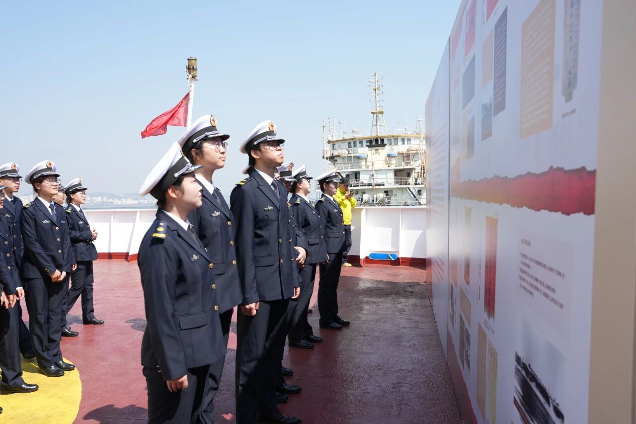 “育鲲”轮上还布置了“一部英雄史、赓续中华魂”纪念展,师生透过图片重温了那段气壮山河的英雄岁月。